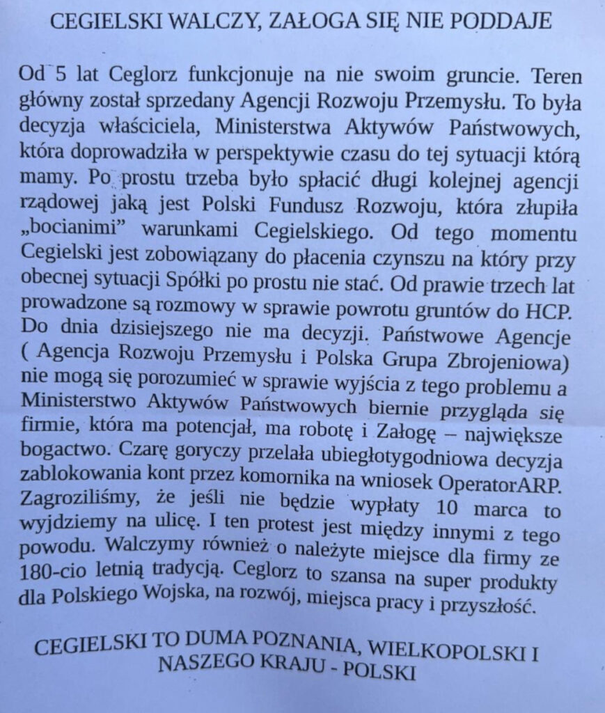 W dniu 12 marca 2026 Pod pomnikiem Poznańskiego Czerwca w sercu Poznania odbyła się pikieta związkowców PGZ HCP H.Cegielski-Poznań SA i Wytwórni Sprzętu Komunikacyjnego w Poznaniu.