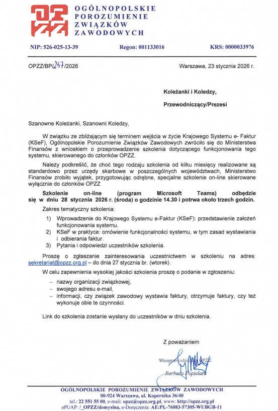 w dniach 11–13 czerwca 2026 r Szczegółowe informacje dotyczące szkolenia zostaną przekazane w odrębnej korespondencji do Przewodniczących Organizacji Związkowych.