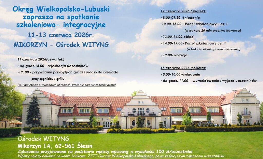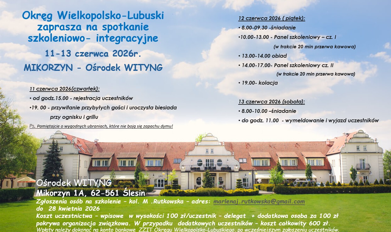Okręg Wielkopolsko-Lubelski zaprasza przedstawicieli organizacji związkowych ZZIT na szkolenie organizowane przez Zarząd Okręgu Wielkopolsko -Lubuskiego które odbędzie się w MIKORZYN koło Konina